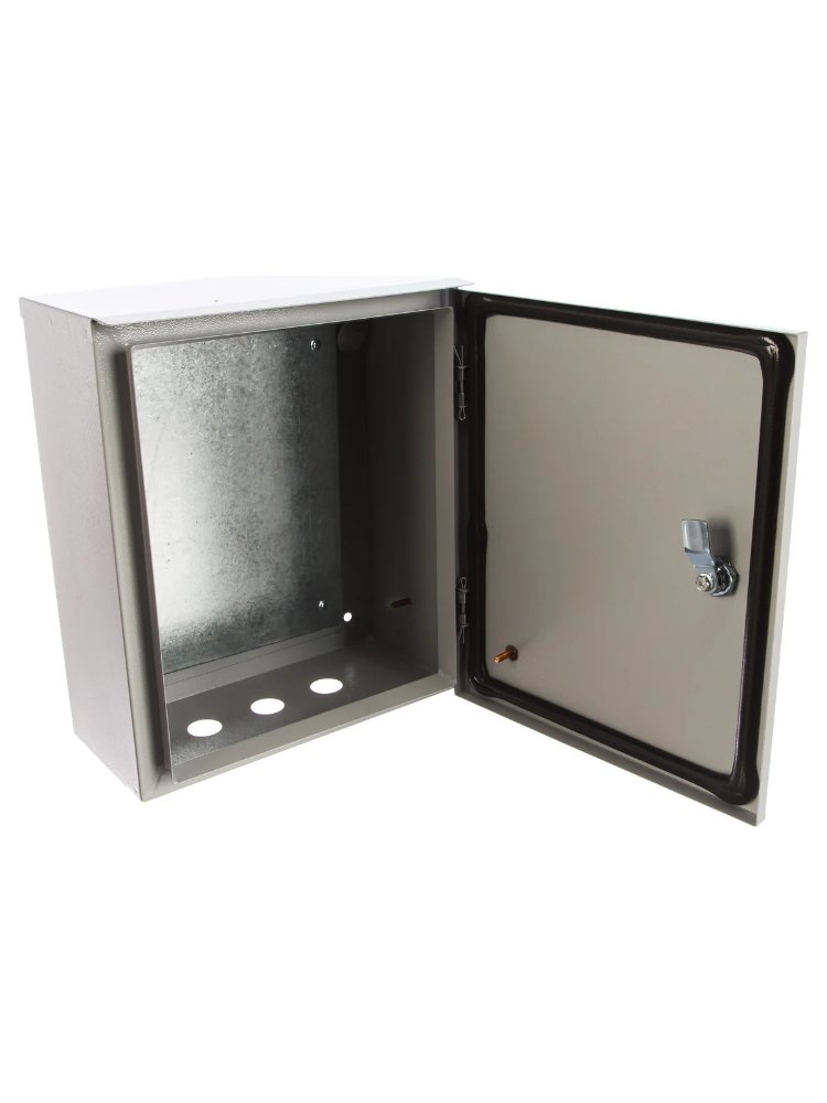 Металлический корпус с монтажной панелью выполнен из прочной стали толщиной 1 мм, имеет габариты 360×300×155 мм и степень защиты IP31, что обеспечивает надежную защиту электрооборудования в сухих помещениях от случайных механических воздействий. Комплектация включает дверь с запиранием на замок, монтажную панель для удобного размещения оборудования и отверстия для ввода кабеля, что упрощает установку и эксплуатацию устройства.