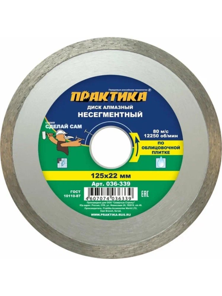Добейтесь идеально ровных и аккуратных резов керамической плитки с помощью профессионального алмазного диска диаметром 125 мм. Сплошная несегментная кромка обеспечивает чистый, без сколов и пыли рез, что делает диск отличным выбором для облицовочных и отделочных работ по кафелю, мозаике и другим хрупким материалам.
