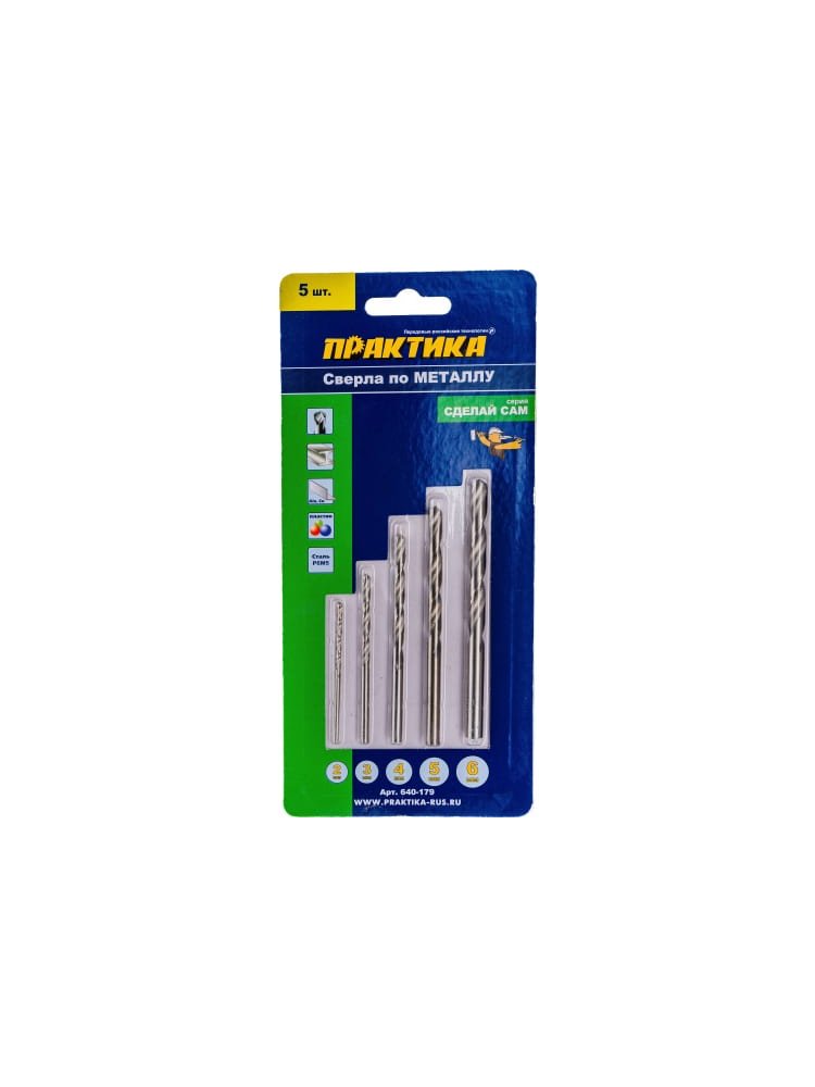 - 5 сверл в комплекте – диаметры: 2, 3, 4, 5, 6 мм