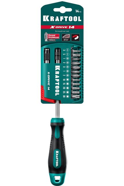 Отвертка-битодержатель KRAFTOOL X-Drive в наборе с насадками изготовлена из высокопрочной Cr-Mo стали. Универсальный набор бит и битодержатель подходят для работы с шуруповертом 14 предметов, сменные биты, магнитный держатель, X-Drive рукоятка для мощности — универсальный комплект для всех видов крепежа.