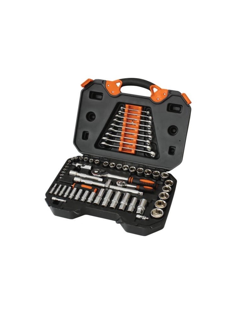 - Комплект: 58 предметов (трещоточные ключи, биты, удлинители, головки 1/2" и 1/4", шестигранники)