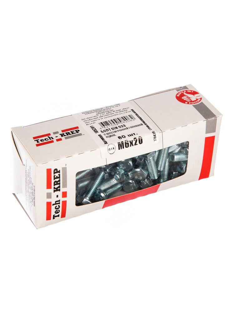 Болт с шестигранной головкой DIN933 оцинкованный М6х20 от Tech-Krep представляет собой надежный крепежный элемент, изготовленный из высококачественной стали с цинковым покрытием для защиты от коррозии. Размер болта М6 (диаметр резьбы 6 мм) и длина 20 мм делают его универсальным для различных монтажных работ. В упаковке с окном содержится 80 штук, что удобно для использования в больших объемах. Конструкция с полной резьбой обеспечивает прочное и устойчивое соединение деталей. Этот крепеж соответствует стандарту DIN933, гарантируя высокое качество и точность размеров.