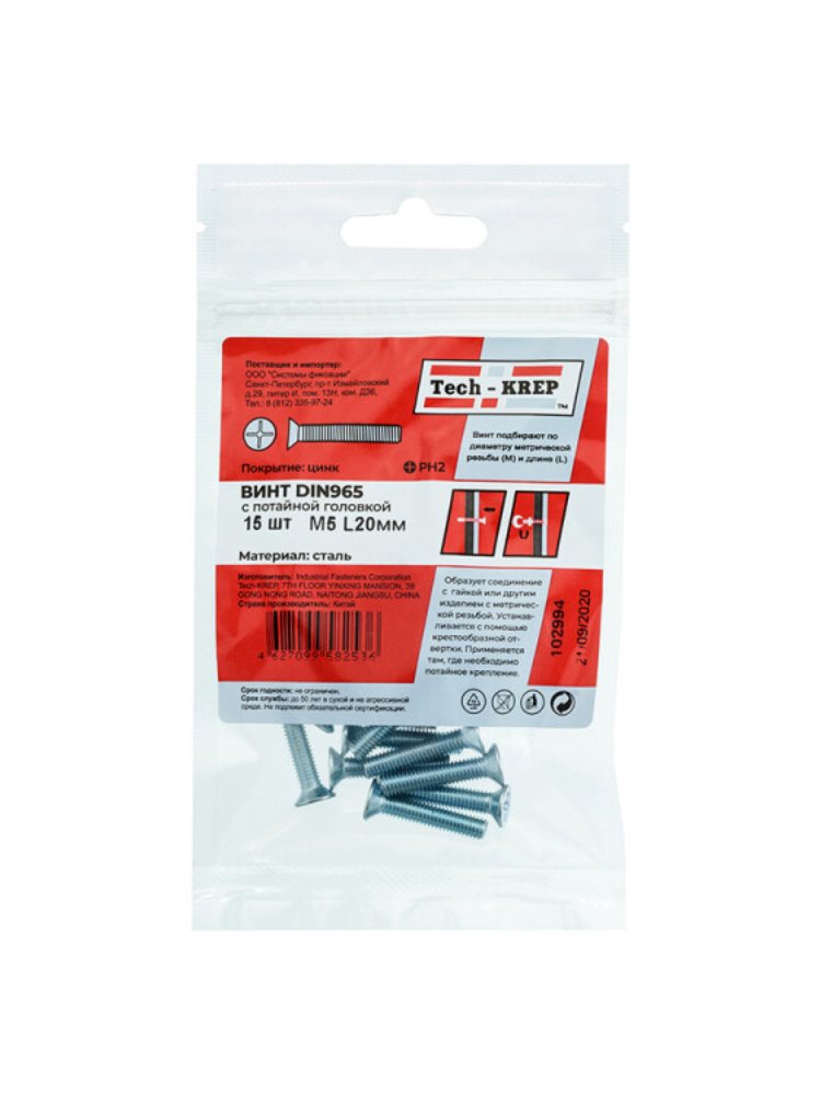 Винты с потайной головкой DIN 965, оцинкованные, размером М5х20, поставляются в упаковке по 15 штук от бренда Tech-Krep. Изготовлены из прочной стали с цинковым покрытием, что обеспечивает надежную защиту от коррозии даже в условиях повышенной влажности. Потайная головка позволяет устанавливать винт заподлицо с поверхностью, что делает крепление аккуратным и эстетичным. Подходят для работы с деревом, металлом и пластиком при использовании соответствующих дюбелей или гаек. Тип шлица — крестообразный (Phillips), что обеспечивает удобство закручивания с помощью шуруповерта или отвертки.