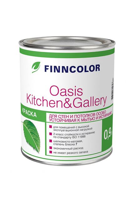 для стен и потолков в сухих и влажных помещениях (кроме ванных комнат) c высокой эксплуатационной нагрузкой (кухни, столовые, вестибюли, коридоры, помещения общественного и коммерческого назначения), требующих частой уборки. Расход 7-9 м²/л - по неровной впитывающей поверхности; 9-11м²/л - по ровной невпитывающей поверхности. Время высыхания 1,5-2 часа перед нанесением следующего слоя. Матовый.