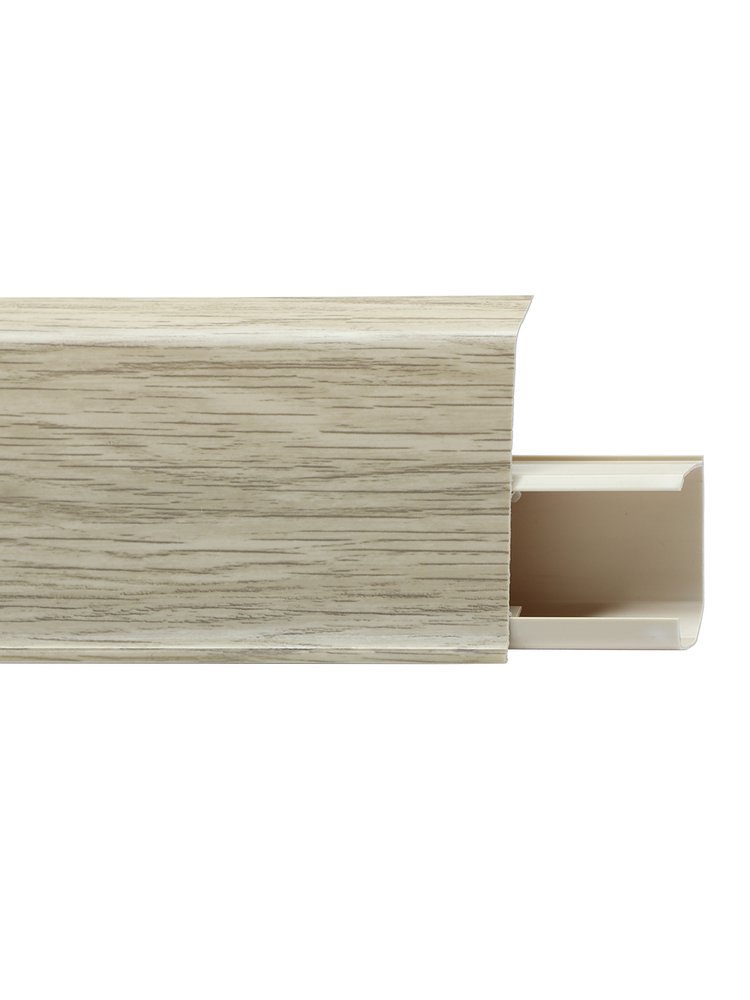 Прочный плинтус в современном древесном оттенке отлично дополняет интерьер, скрывает стыки напольных покрытий и защищает стены от повреждений. Идеально подходит для жилых, офисных и коммерческих помещений благодаря универсальному дизайну и стойкости к износу.
