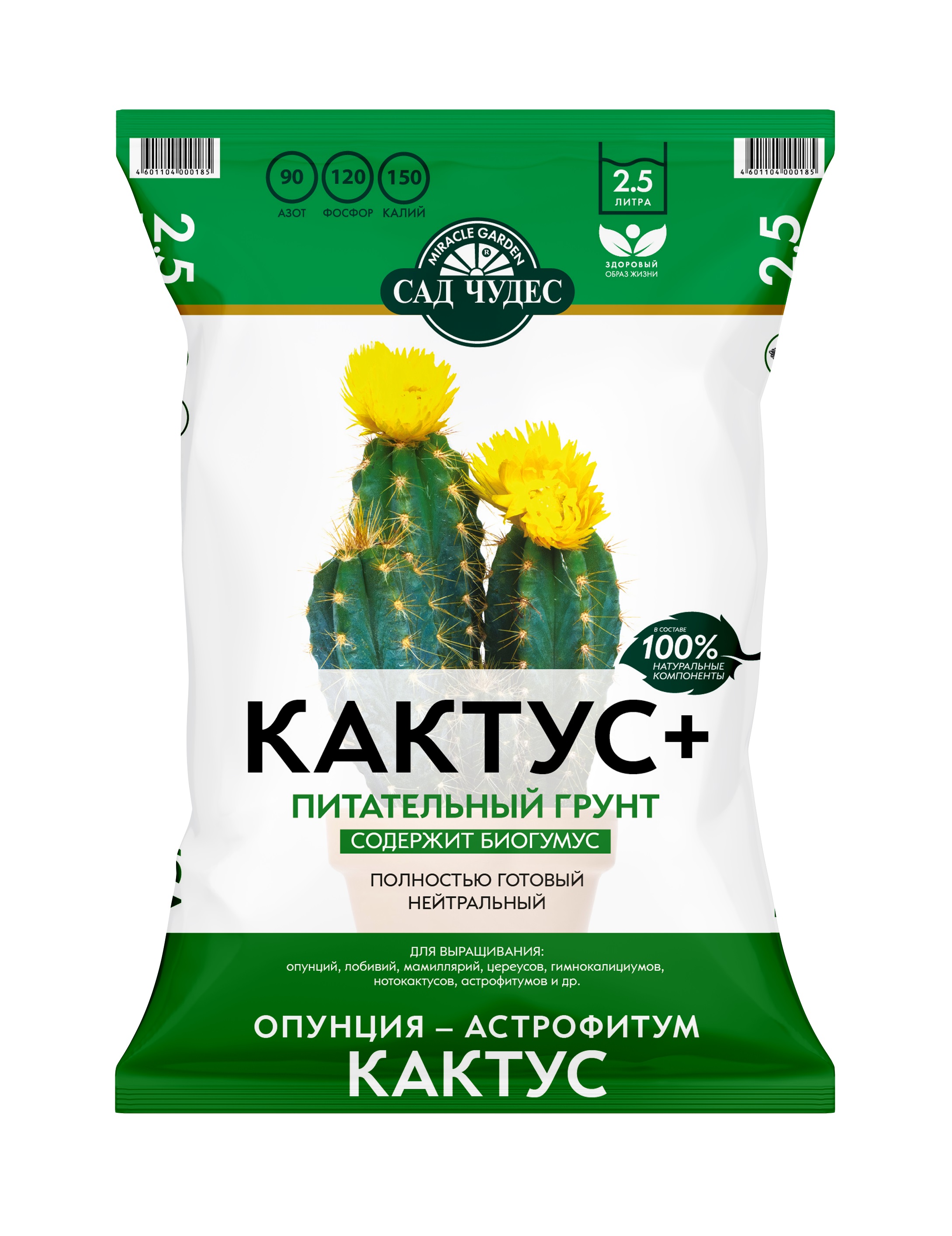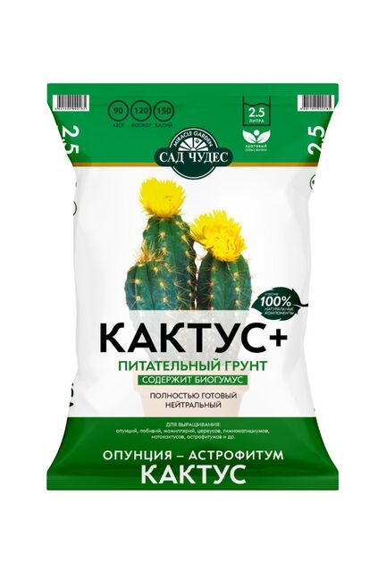 Грунт 2,5 л для кактусов и суккулентов с биогумусом и дренажными компонентами, нейтральный pH, готовый к применению и удобный в использовании.