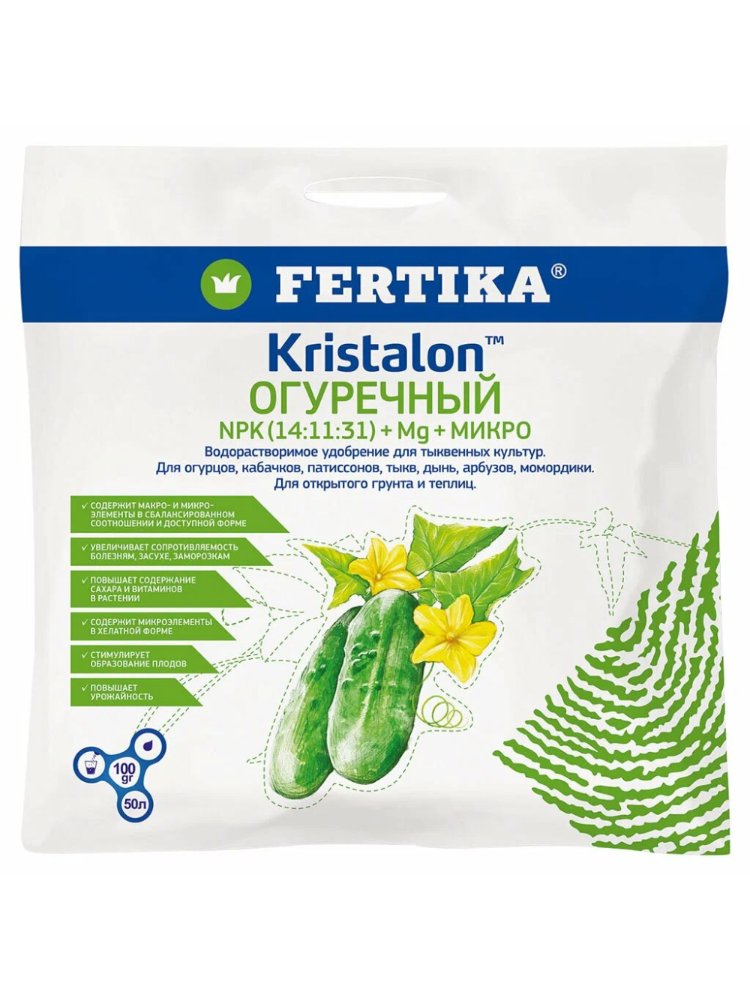Выберите оптимальное питание для обильного и здорового урожая огурцов в открытом грунте и теплицах! Специализированное водорастворимое удобрение легко разводится, мгновенно усваивается растениями и обеспечивает им полноценное сбалансированное питание.