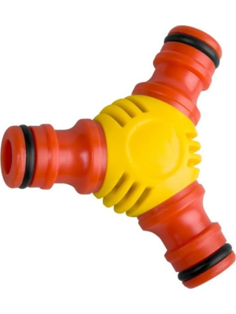 Удобный тройник-распределитель для шлангов с тремя штуцерами, прочный пластик, герметичные соединения, оптимален для систем полива и водоснабжения.