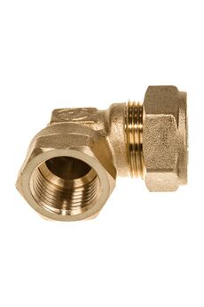 Латунный угольник для крепкого соединения труб 15 мм с резьбовым выходом 1/2'', устойчив к давлению и коррозии, прост в установке.